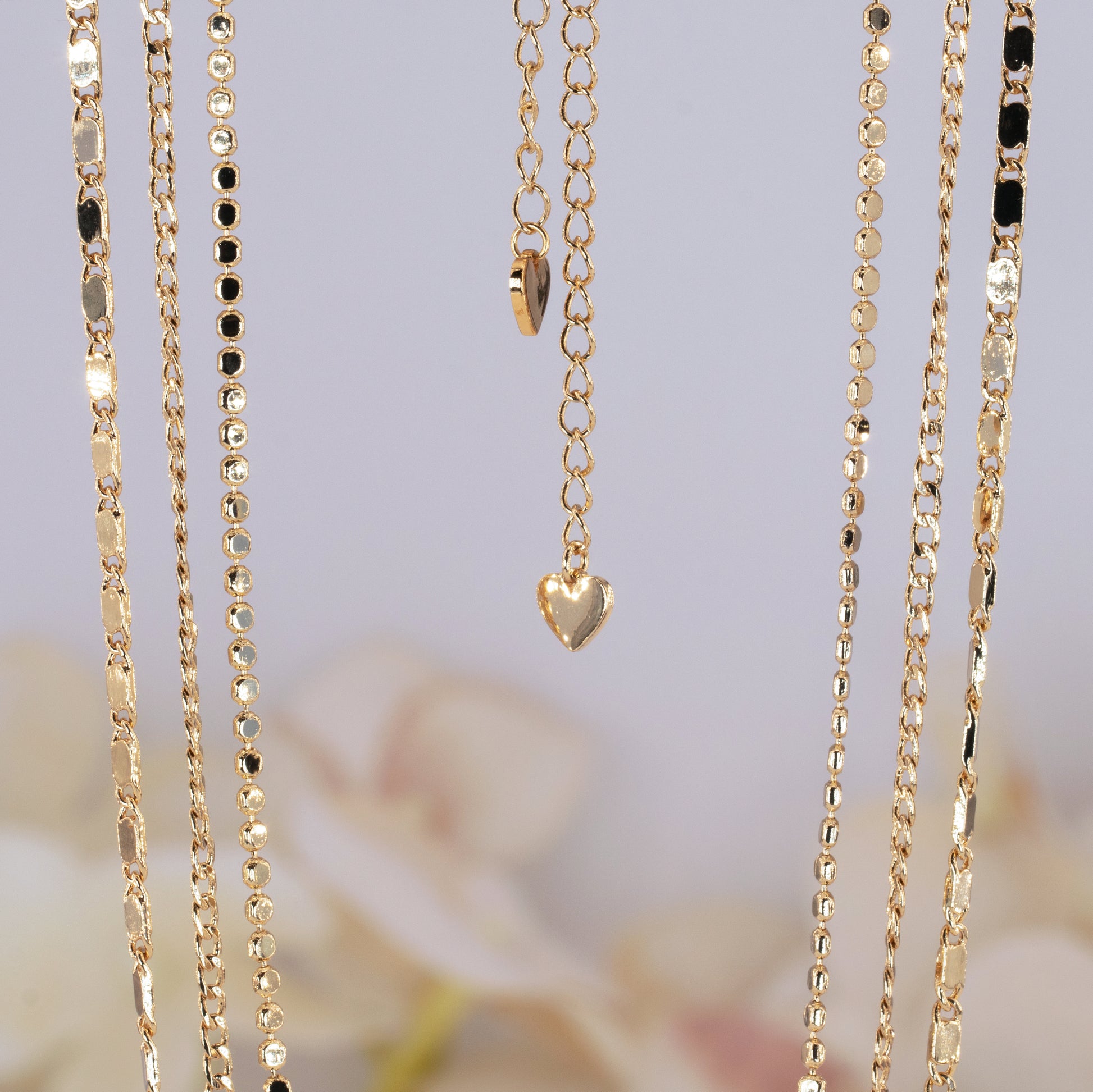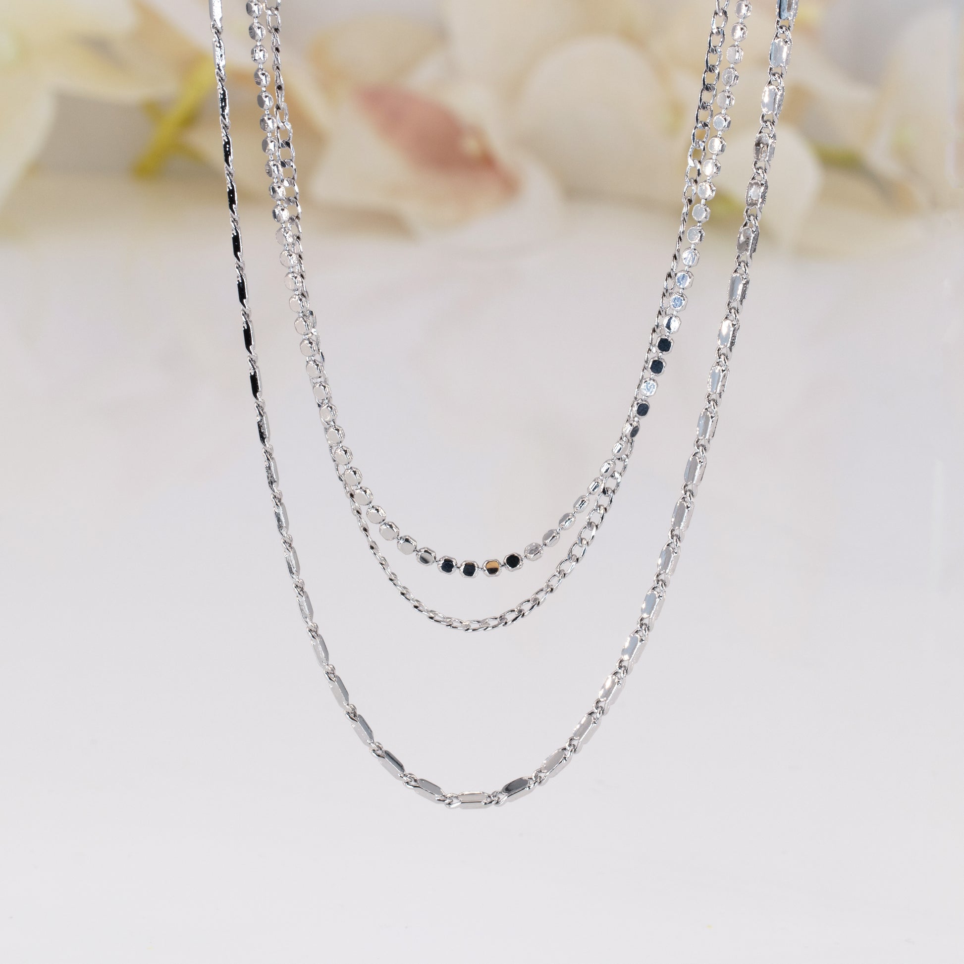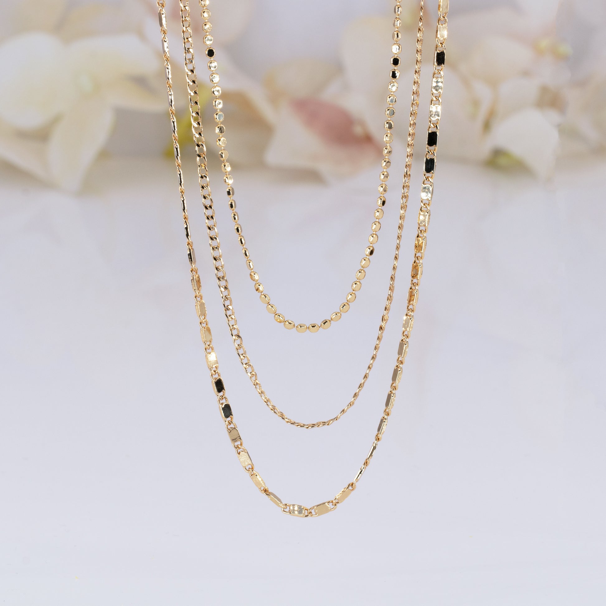 Sold as 3 pieces of fancy chain set as pictures. 14k gold plated or platinum silver plated. All chains has separated closers to wear separated or to wear together as layering.