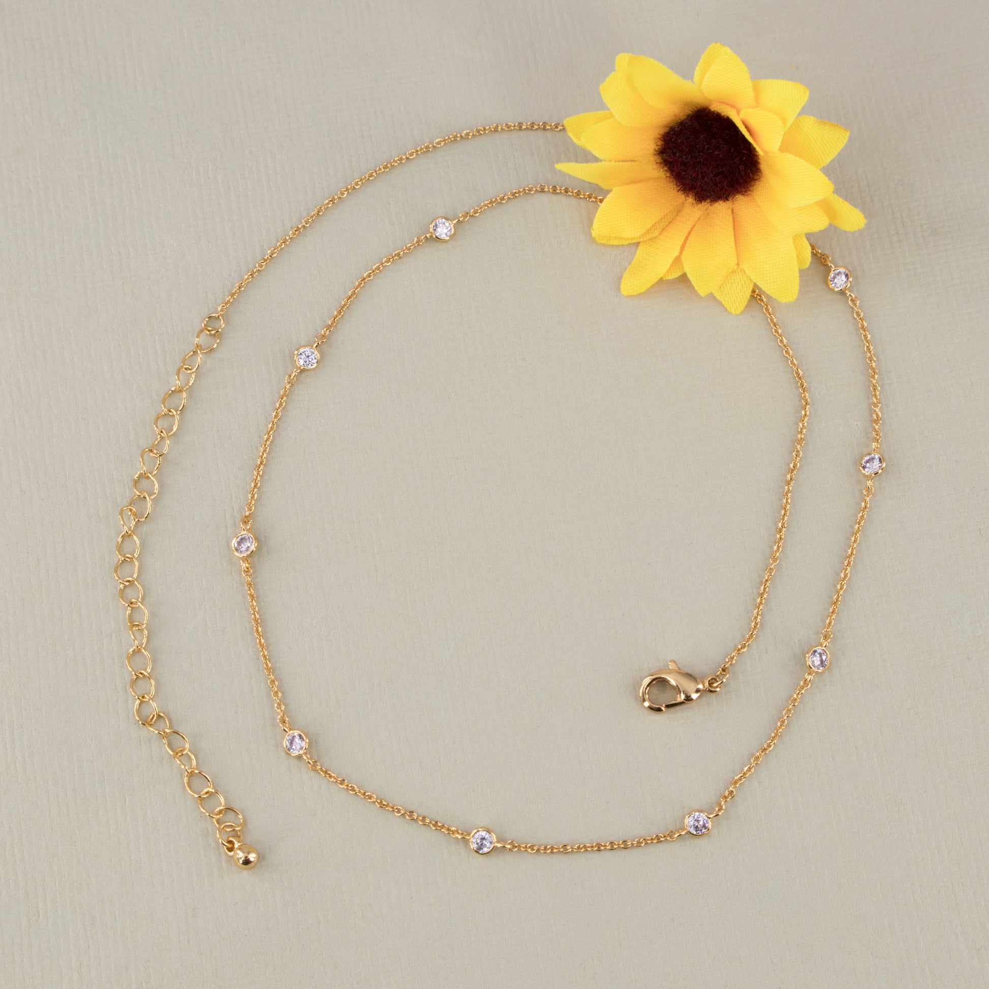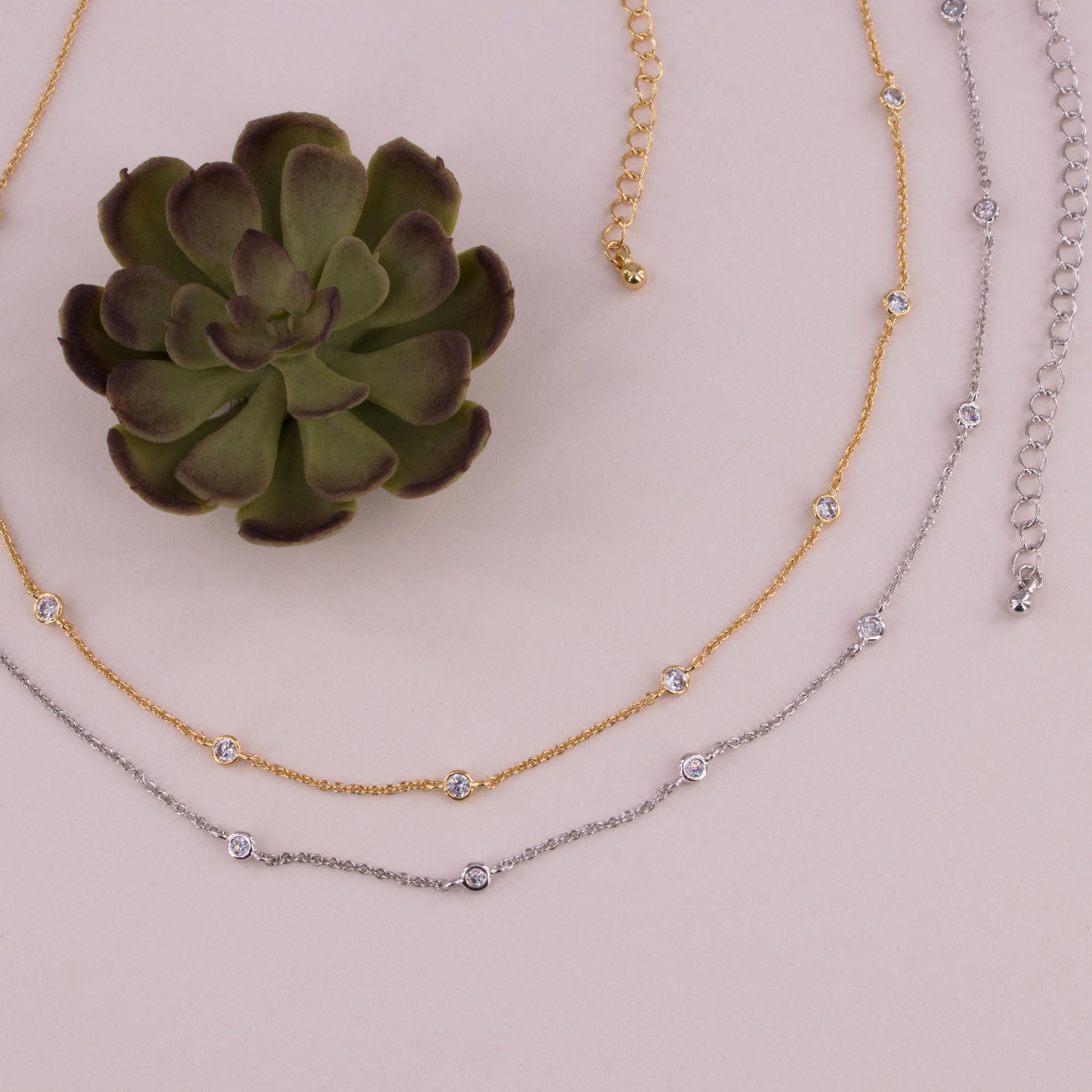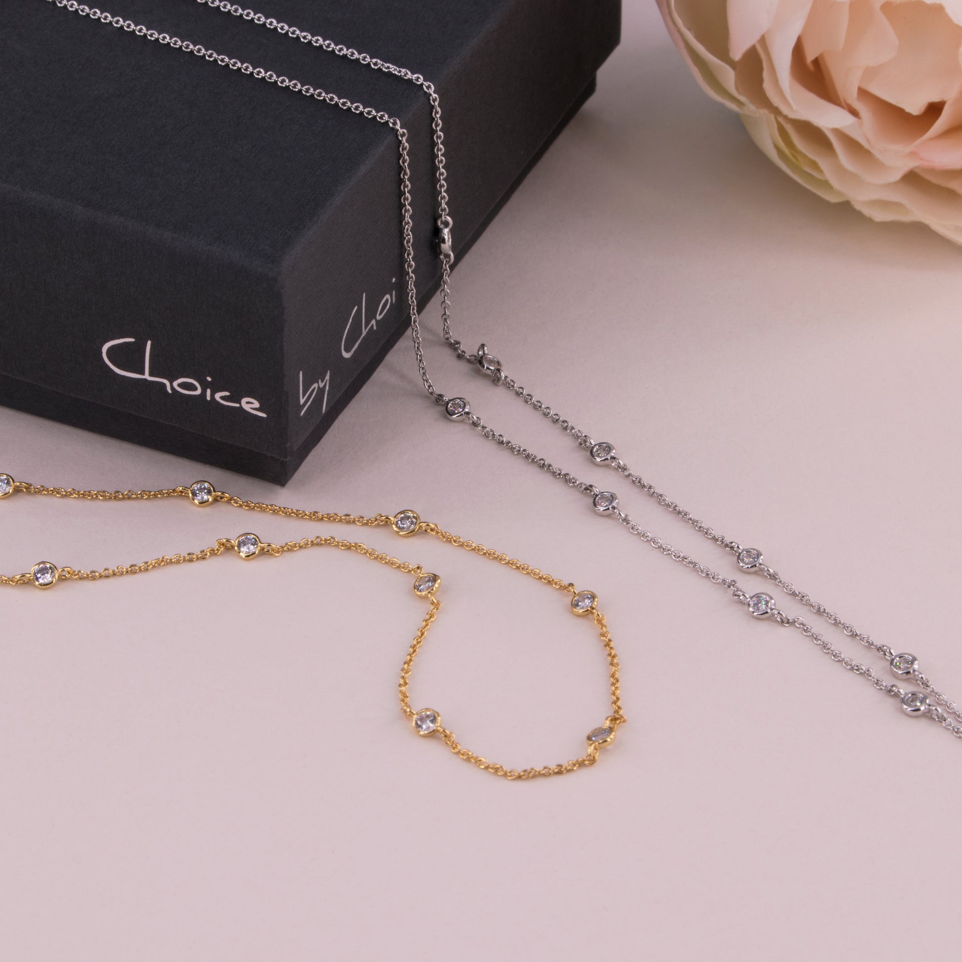 A delicate necklace with cubic zirconia crystals scattered throughout the chain. It is effortless stylish look. The perfect necklace to layer with other necklaces to create your own individual look or worn on its own with any outfit.