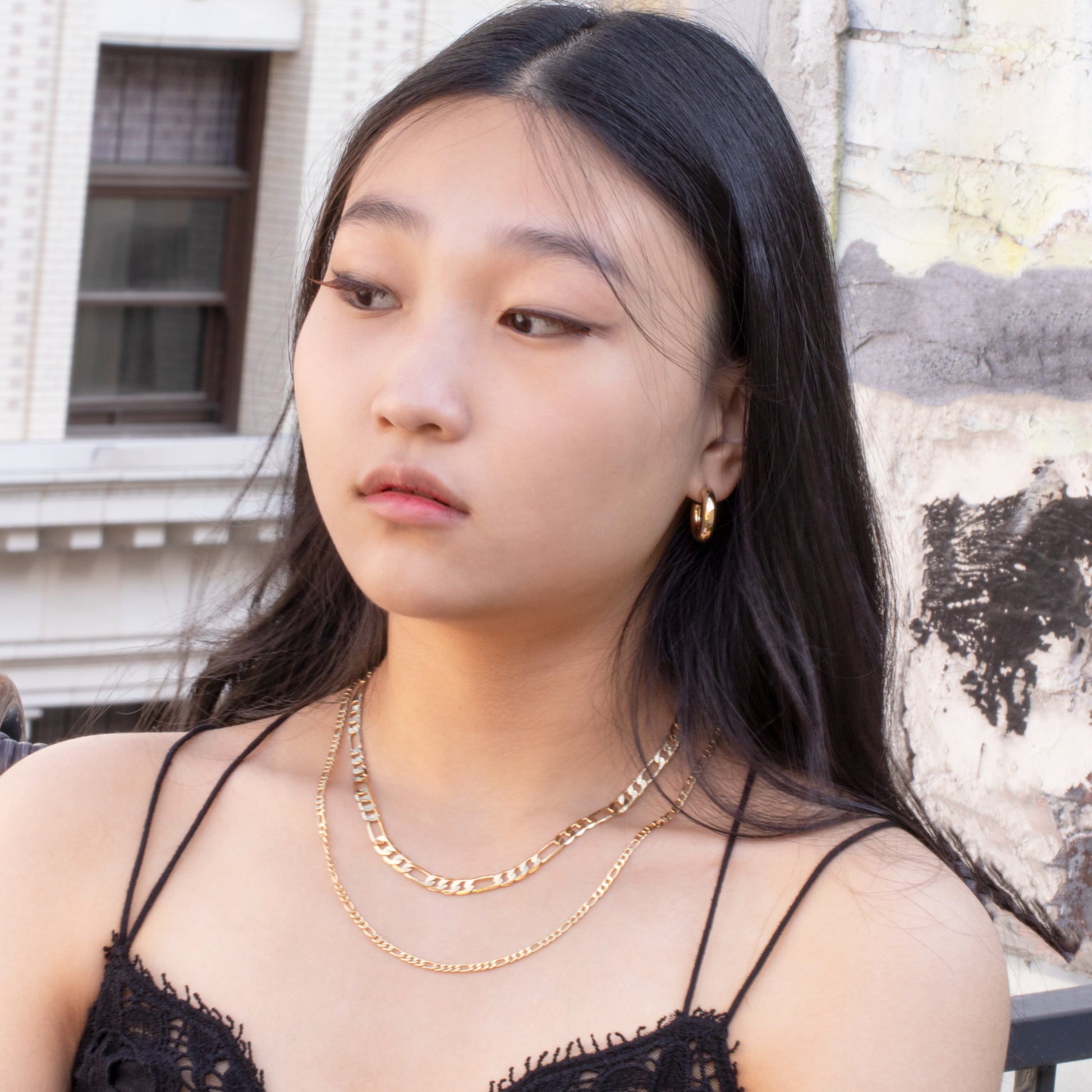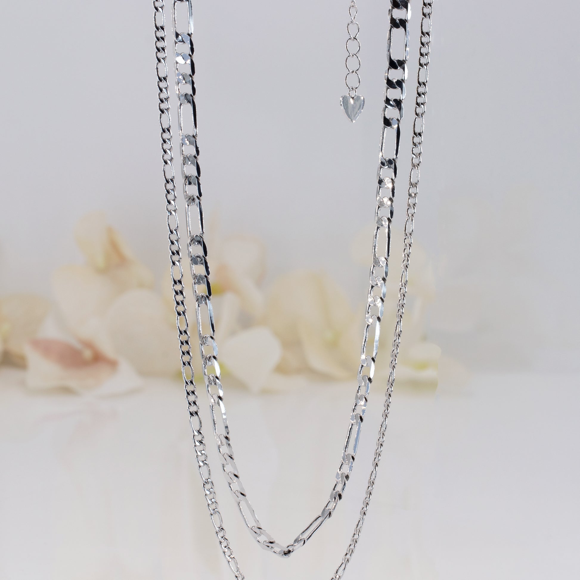 Sold as 2 pieces necklace set as pictures. 14k gold plated or platinum white gold plated. Both chains has separated closers to wear separated or to wear together as layering. High quality flat Figaro chains comes in 2 different width & length.