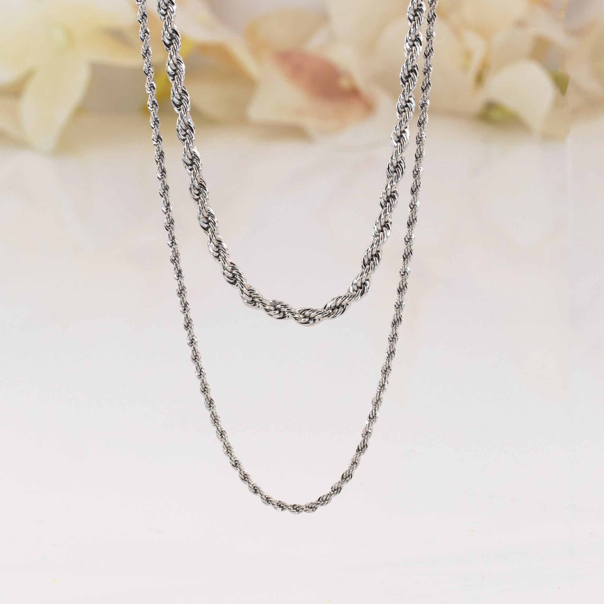 Sold as 2 pieces necklace set as pictures. 14k gold plated or platinum white gold plated. Both chains has separated closers to wear separated or to wear together as layering. High quality rope chains comes in 2 different width & length.